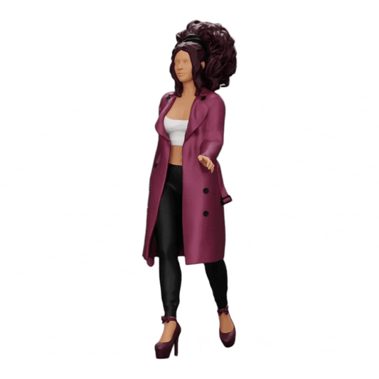 Miniatur Figur: Modische Frau mit lockigem Haar in langen, offenen Mantel spaziert (Nr. a40)