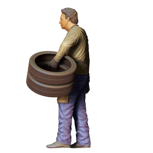 Miniatur Figur Mechaniker trägt Reifen: Reifenwechsel in der Autowerkstatt (Nr. 238)