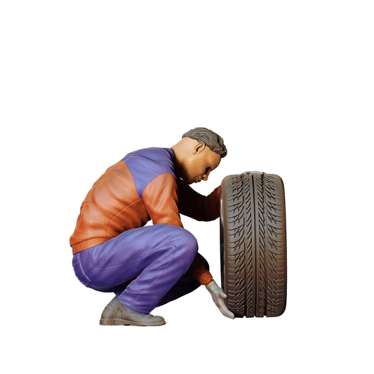 Miniatur Figur Mechaniker kniend: Reifenwechsel in der Autowerkstatt (Nr. 236)