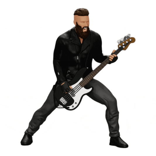Miniatur Figur: Rockstar spielt Bassgitarre in Lederjacke mit langen Haaren und Bart (Nr. a12)