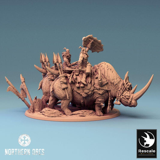 Tabletop Miniatur: Ork Kriegsherr auf Nashorn-Kriegsbestien, Bestienreiter-Gespann, Monsterkavallerie (24_04_D3)